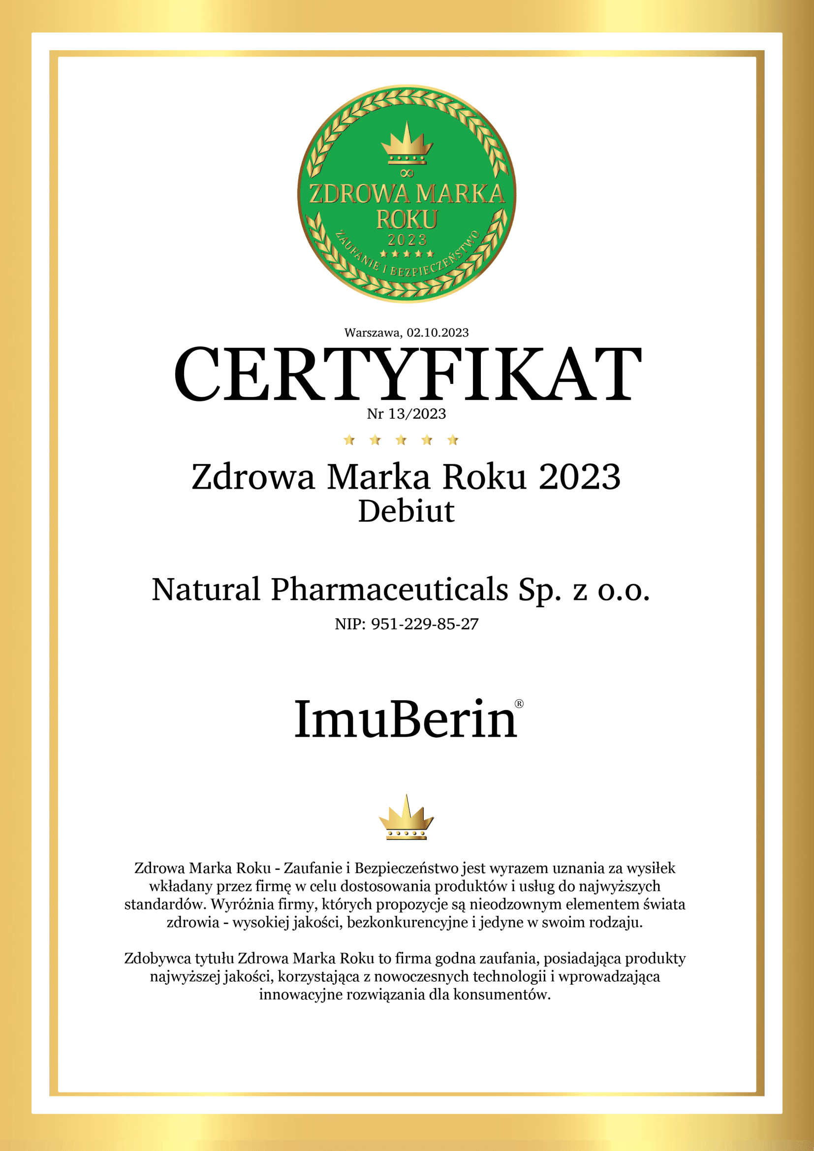 Zdrava blagovna znamka leta* je poljski projekt, ki nagrajuje in promovira najboljše blagovne znamke na trgu, ki ponujajo izdelke, storitve in rešitve najvišje kakovosti, ustvarjene z mislijo na zdravje in zdrav življenjski slog. Z veseljem sporočamo, da je ImuBerin® prejel naziv zdrava blagovna znamka leta 2023 v kategoriji Novinec.